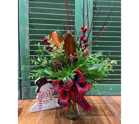 This is a beautifully scented vase filled with so much wintery greenery. Decorated with berries, cones and ribbons, this will say Merry Christmas to any recipient! *please not ribbon may vary....does not include snowman decoration.